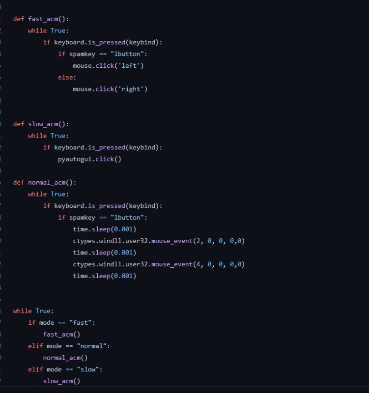 бля, я немного дебил, я же сам видел что кпс меняется когда добовляю слипPython:def fast(): while True: if keyboard.is_pressed("v"): ctypes.windll.user32.mouse_event(2, 0, 0, 0, 0) ctypes.windll.user32.mouse_event(4, 0, 0, 0, 0) def slow(): while True: if keyboard.is_pressed("v"): ctypes.windll.user32.mouse_event(2, 0, 0, 0, 0) ctypes.windll.user32.mouse_event(4, 0, 0, 0, 0) sleep(0.1) def normal(): while True: if keyboard.is_pressed("v"): ctypes.windll.user32.mouse_event(2, 0, 0, 0, 0) ctypes.windll.user32.mouse_event(4, 0, 0, 0, 0) sleep(0.035)