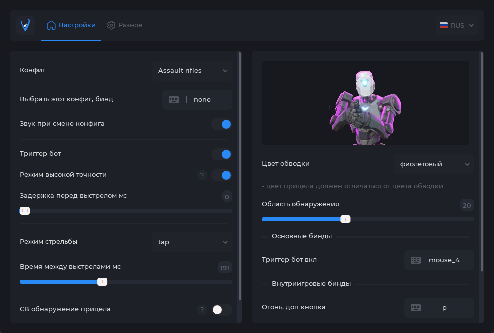 - Продвинутая конфиг система, точная настройка под разные виды оружия для максимальной эффективности;
