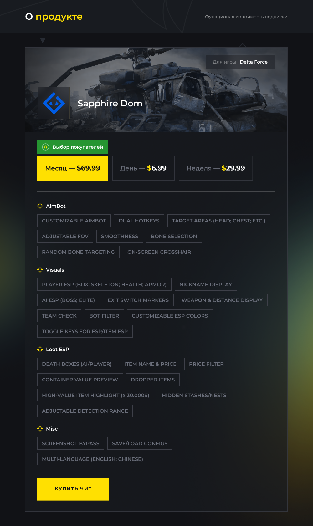 Получите Sapphire Dom для Delta Force — мощный чит с функциями вроде AimBot, Visuals, Loot ESP и многими другими. Наслаждайтесь безопасной и производительной игрой без риска обнаружения.