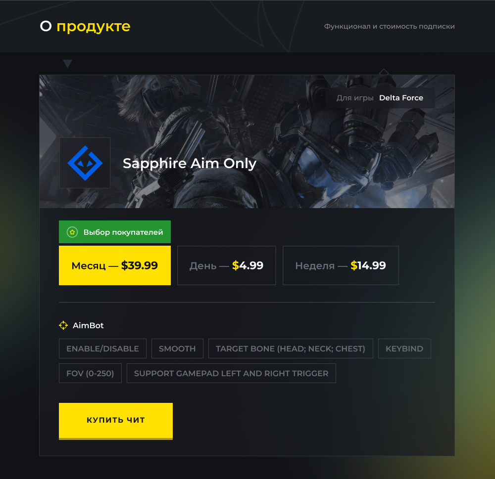 Получите Sapphire Aim Only для Delta Force — специализированный чит, сосредоточенный на функциональности AimBot, обеспечивающий безопасную и не обнаруживаемую игру.
