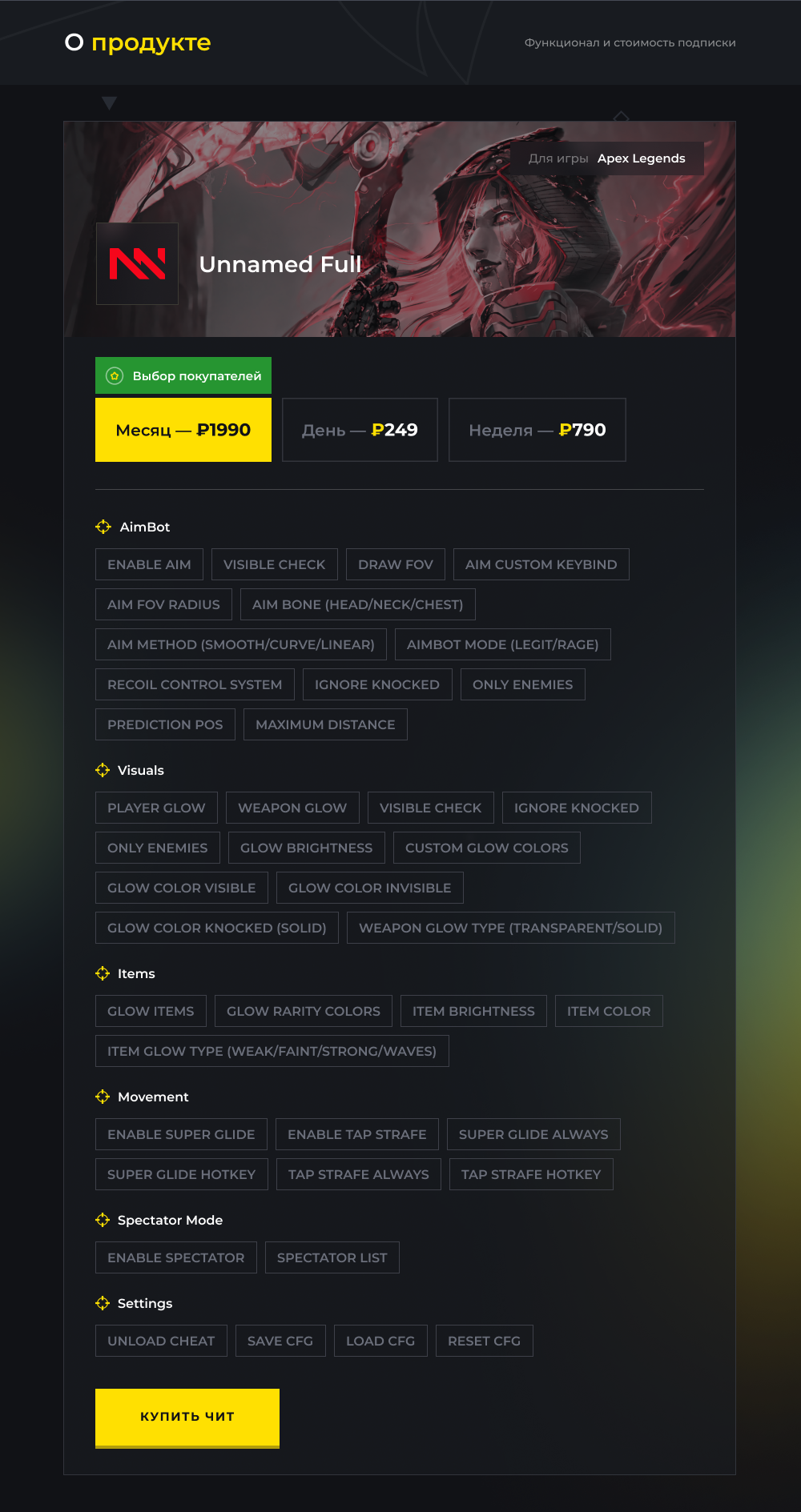 Стань непревзойденным в Apex Legends с читом Unnamed Full! Получи преимущество благодаря передовому aimbot, уникальным визуальным эффектам, позволяющим видеть сквозь стены, и функциям наблюдения, раскрывающим, кто за тобой следит. Полностью скрыт и надежно защищен!