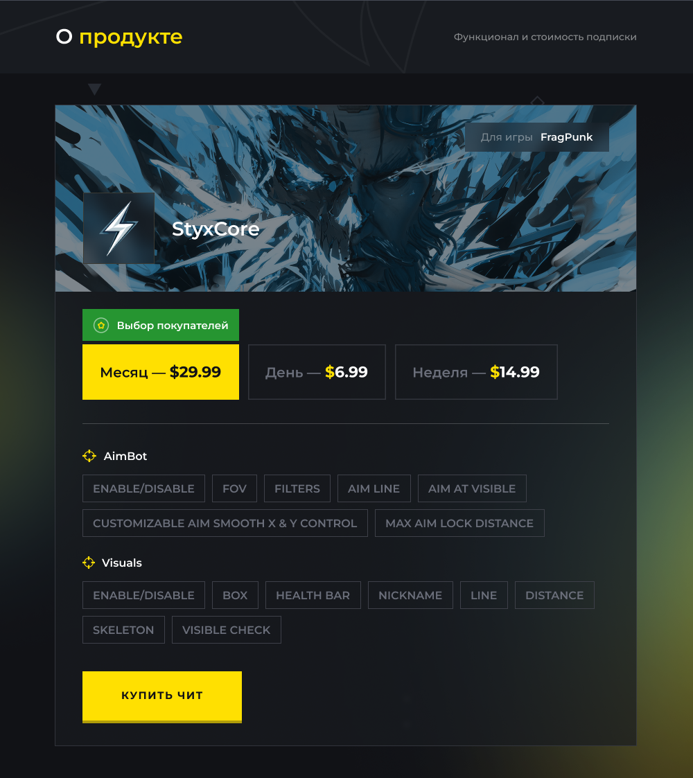 StyxCore для FragPunk: Улучшите свой игровой опыт с помощью передовых инструментов, включая настраиваемый AimBot с плавной регулировкой по осям X и Y и расширенным диапазоном захвата цели, погружающие Visuals с контурами боксов, индикаторами здоровья, никнеймами и визуализацией скелетов, а также отслеживанием расстояния, линиями соединения и системой проверки видимости для тактического превосходства.