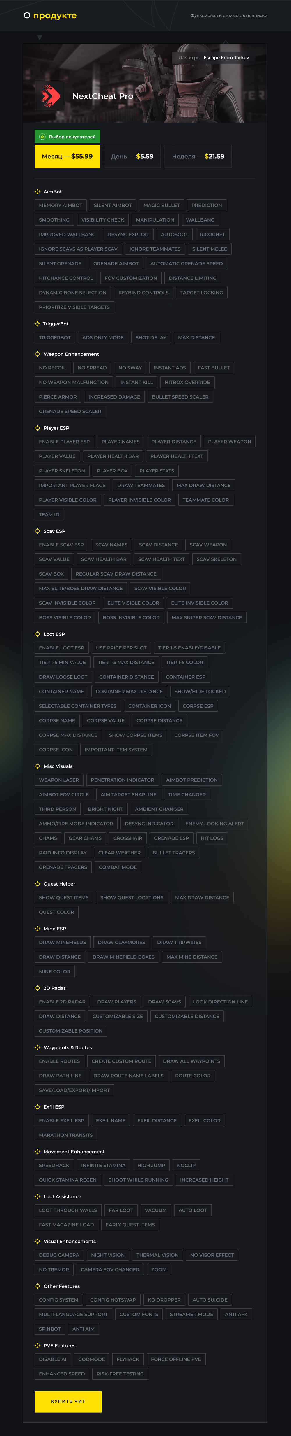 Продукт NextCheat Pro для игры Escape from Tarkov
