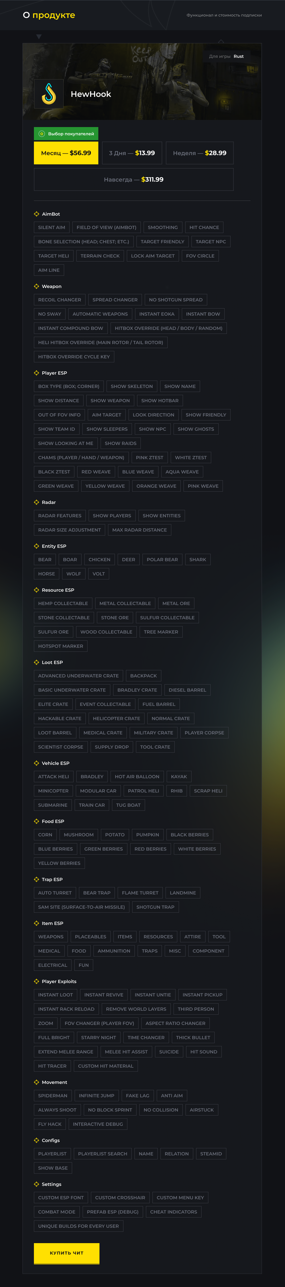 HewHook для Rust: Премиальный приватный чит с silent aim и хит-шансом, полным контролем отдачи/разброса/качания, мгновенными Eoka/луком, расширенными хитбоксами (включая роторы вертолётов), полным Player ESP с чамсами, индикатором рейдов, просмотром хотбара и «смотрит на меня», 2D-радаром, ESP на весь мир (животные, все ресурсы, каждый тип ящиков, дроп, техника, ловушки, еда), плюс мощные эксплойты: спайдермен, полёты, мгновенный лут/оживление, толстые пули, увеличенная дистанция ближнего боя, дебаг-камера, вид от третьего лица, полный свет и многое другое. Уникальная сборка для каждого покупателя + доступна пожизненная версия.