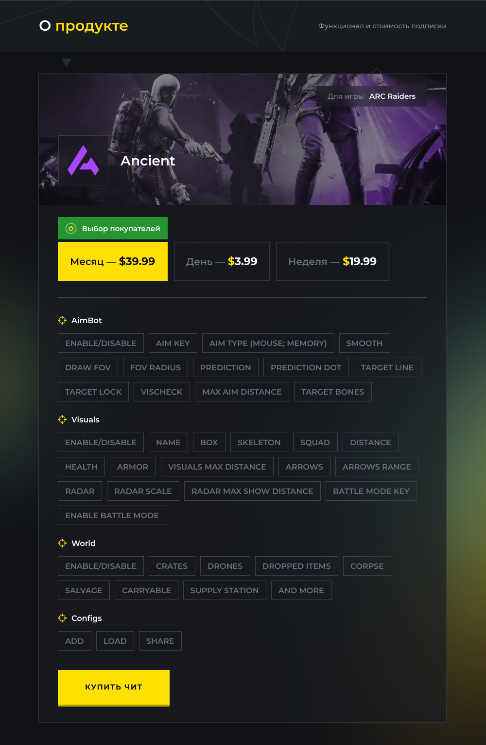 Ancient для ARC Raiders: Высококачественный приватный чит с плавным memory/mouse аимботом, полным набором визуалов (боксы, скелет, здоровье/броня, состав сквада), 2D-радаром, полным ESP мира (ящики, дроны, трупы, точки сбора ресурсов, переносимые объекты, станции снабжения и многое другое) и удобной системой конфигов.