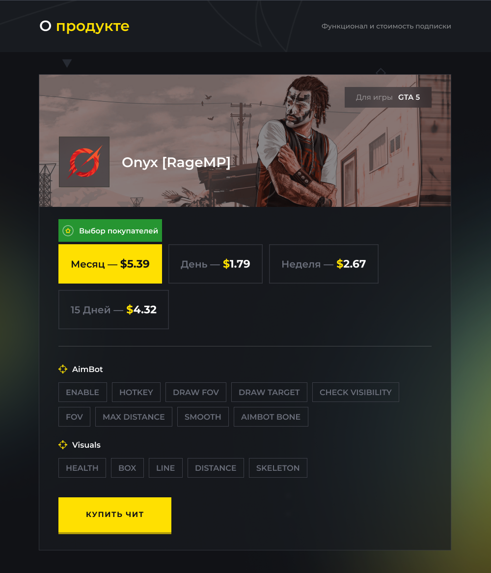 Onyx [RageMP] для GTA 5: Надёжный приватный чит для серверов RageMP с плавным аимботом (проверка видимости, отрисовка FOV и цели, выбор кости) и чистыми визуалами игроков (здоровье, боксы, линии, дистанция, скелет). Простой и безопасный — идеально подходит для повседневного ролплея или экшена на RageMP.