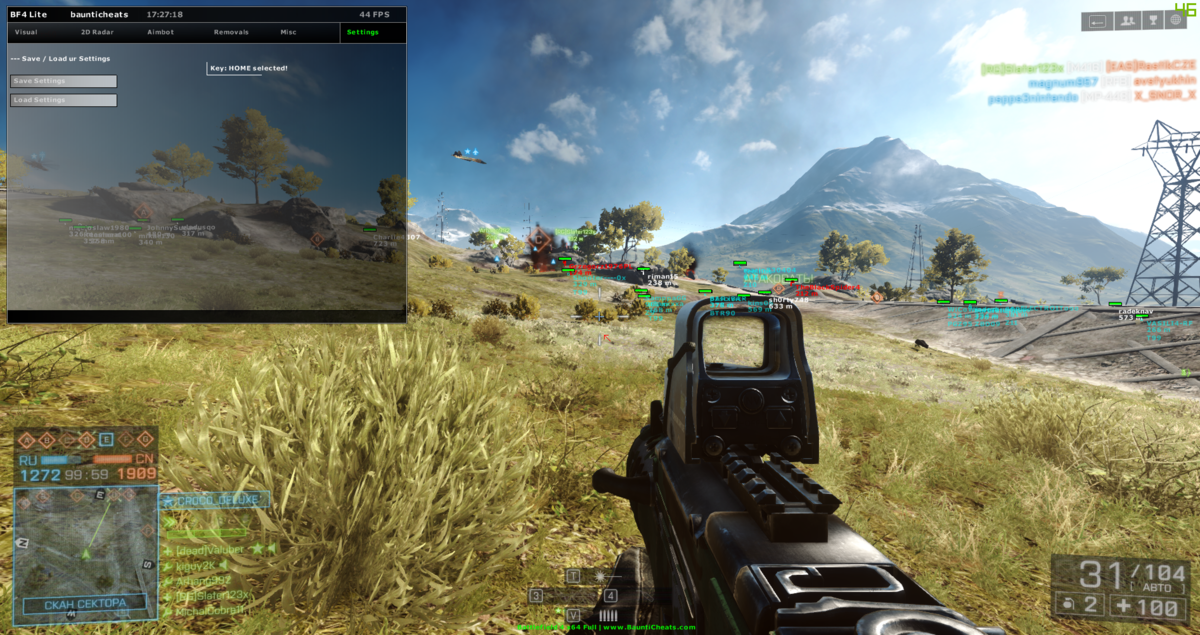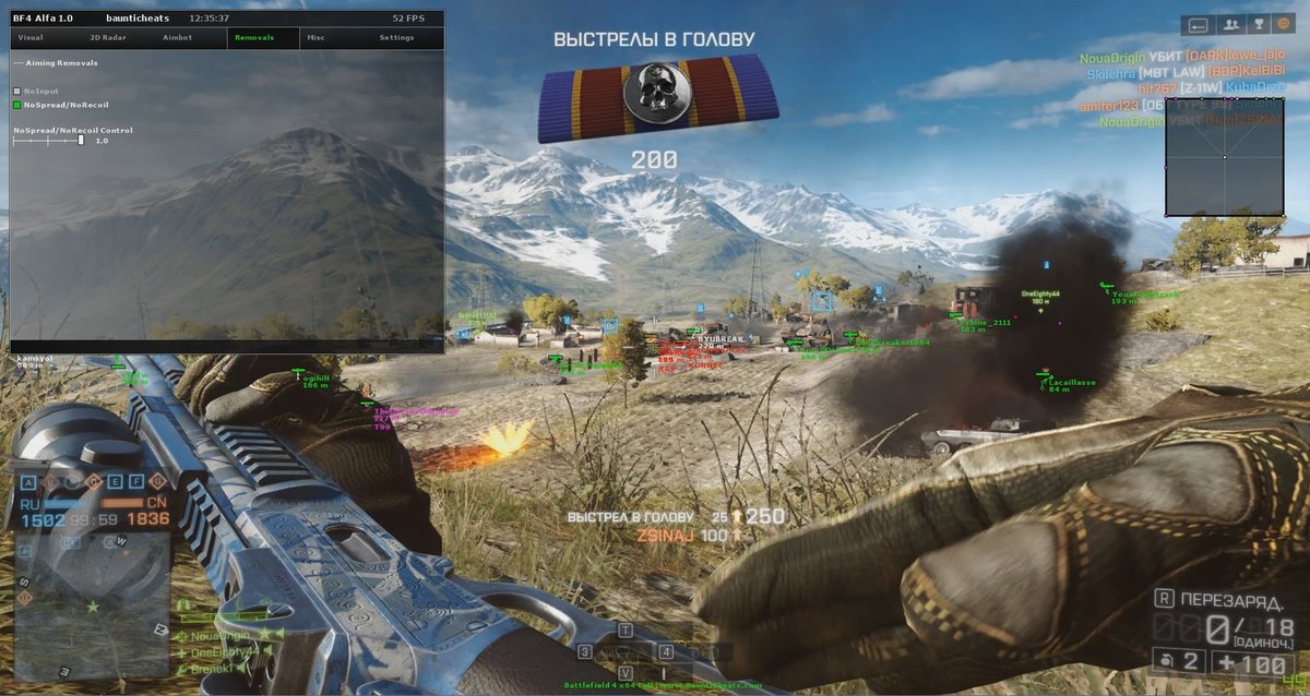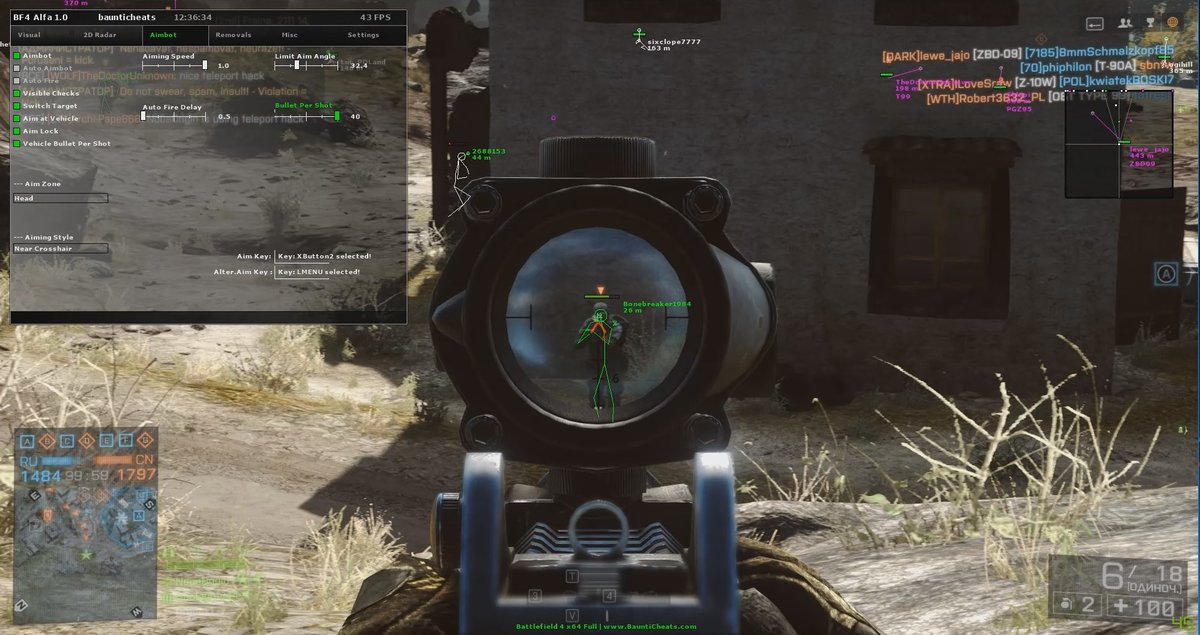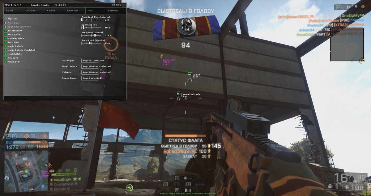 Читы для Battlefield4. В чите для BF4 есть Аимбот с помощью которого Вы будите доминировать в игре и с легкостью убивать врагов. Аимбот просчитывает движения цели и баллистику пули, что значительно упрощает попадание в цель! BF 4 чит покажет всех игроков, технику, любые гранаты и мины, в чите для бателфилд 4 есть радар который будет отображать Вам игроков на карте, в чите для БФ4 есть функция No Recoil которая отключает отдачу для любого оружия и разброс пуль.
