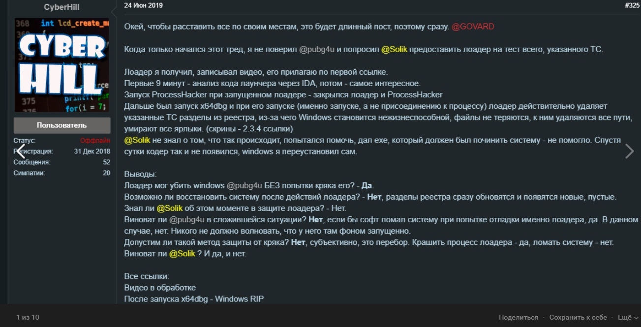 @Solik убедил всех что не знал о том что делает программа, и сам оказался в шоке (хотя половину постов в его теме были о том что я вру и ничего подобного в софте нет - это все мой код и подделка). В этот же раз он лично признался что попросил добавить меру защиты в софт, и да же скидывал скриншоты с разработчиком. Согласился с такой мерой защиты - т.е он дал ясно понять, что он за такой метод. После кодер согласился с такой мерой защиты - сказал что ее да же мало. И по учебнику
